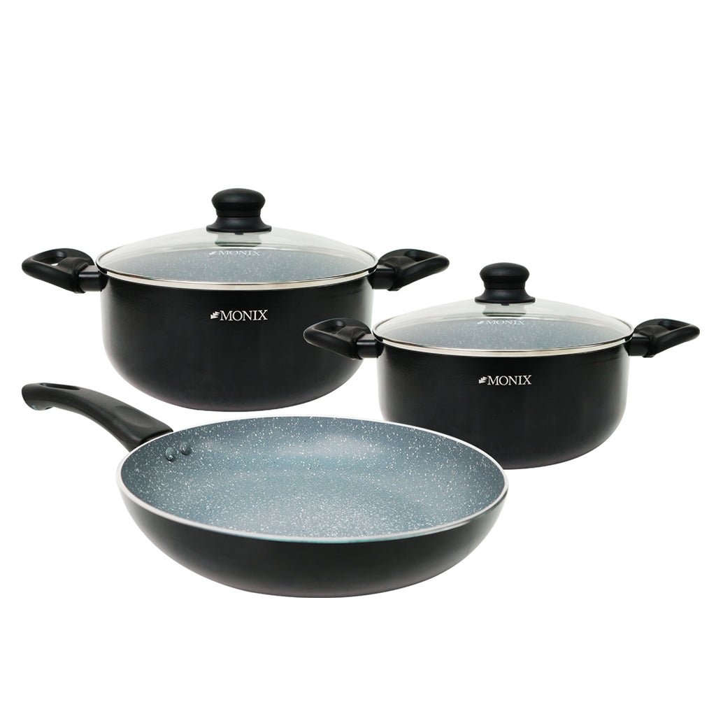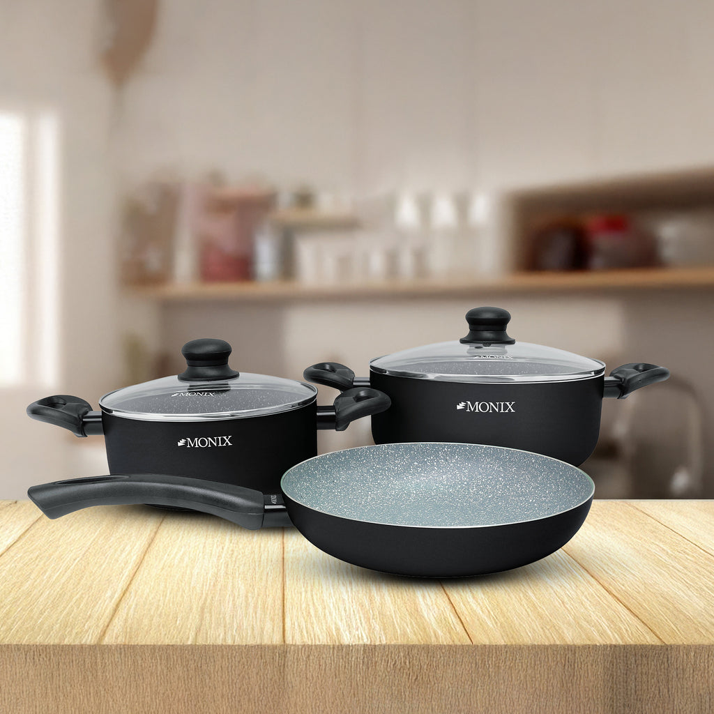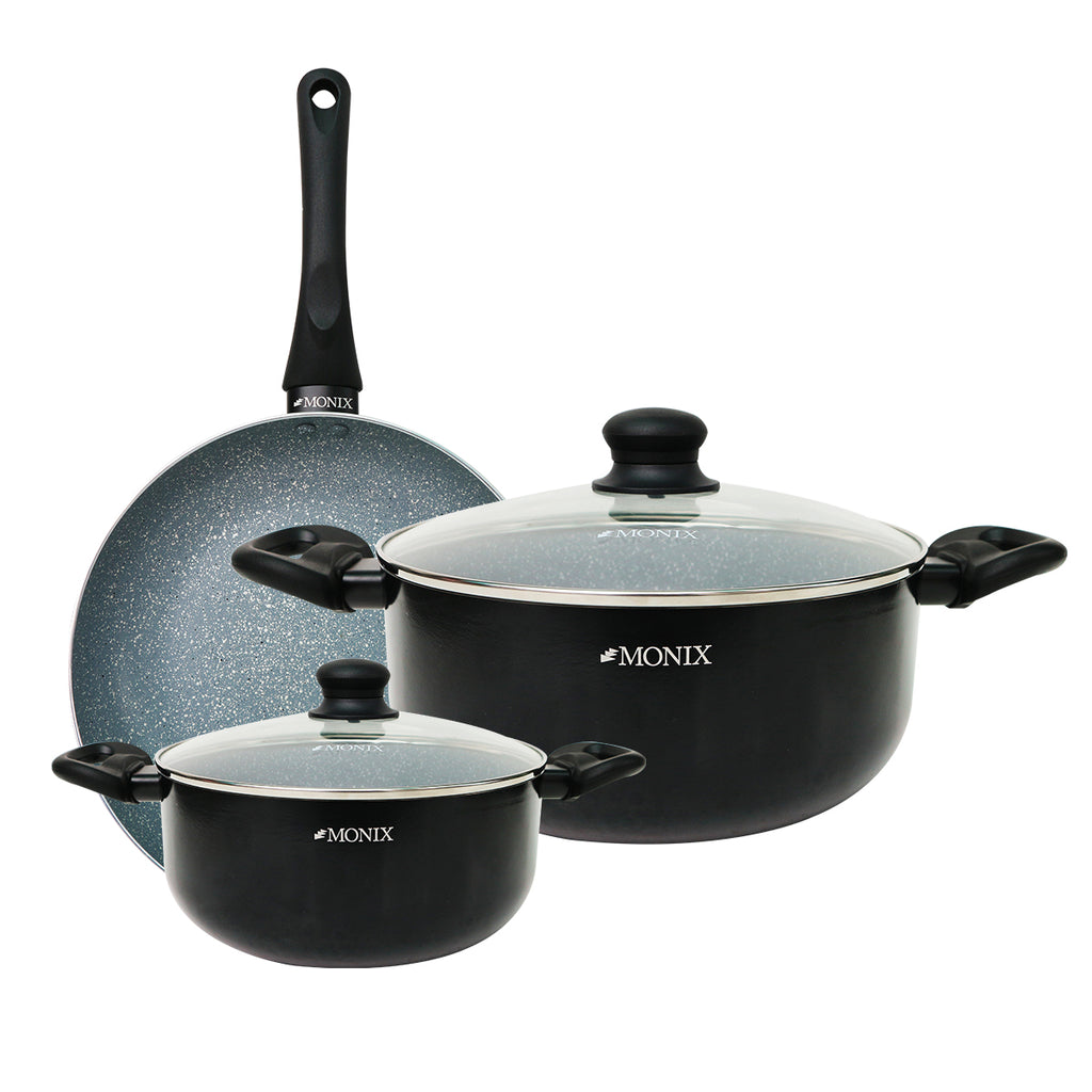✔️Doble recubrimiento de antiadherente de mármol permite un mejor desempeño y durabilidad. ✔️Pomos, asas y mangos en baquelita. ✔️Tapas de vidrio temperado. ✔️Apto para todo tipo de cocina, inclusive inducción.